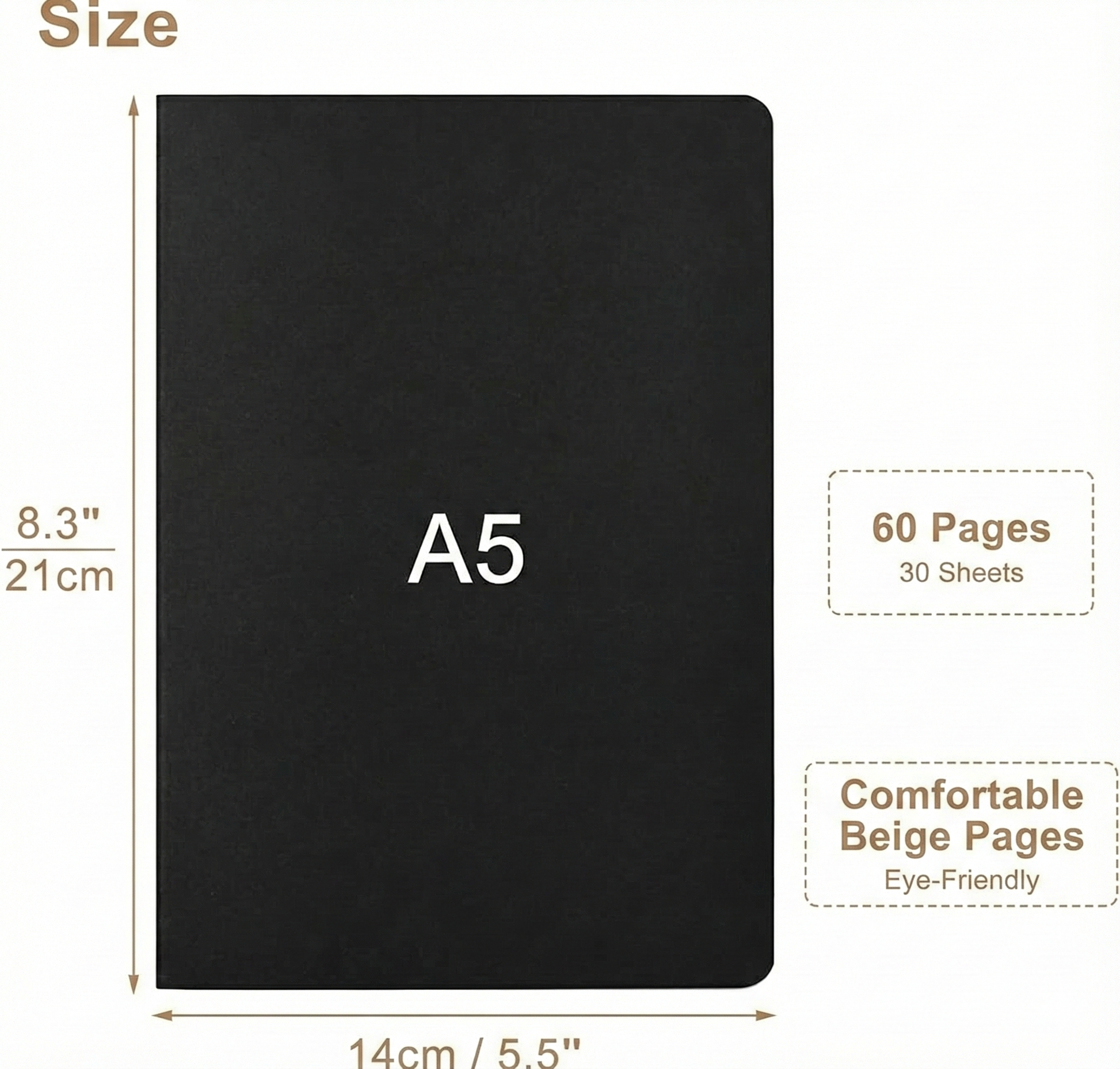 60 pages (30 sheets) of comfortable, eye-friendly beige paper.